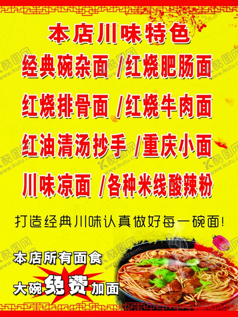 共享素材,尺寸大小是3543*4724像素,川味面馆是由免抠元素设计师xoyo7908114上传,浏览本次作品的您可能还对川味凉面,各种面,面点,面食,牛肉面,排骨面,酸辣粉,面馆菜单,菜单,免抠元素,,免抠元素感兴趣。
