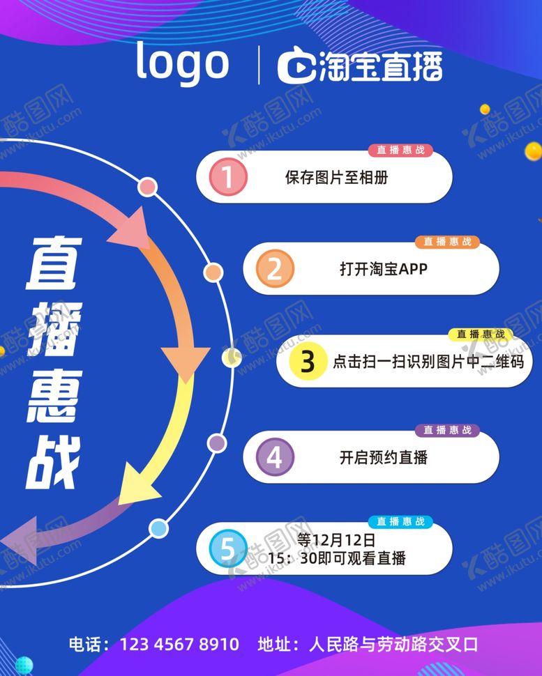 原创共享素材,尺寸大小是2083*2600像素,直播流程是由平面广告设计师laohuob上传,浏览本次作品的您可能还对彩色,蓝色,简约,大气,细节,图片,直播,流程,,平面广告,,平面广告感兴趣。