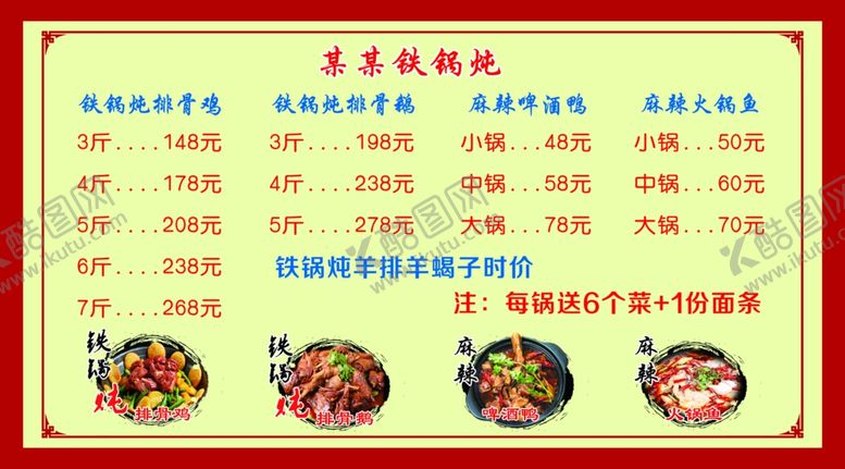 共享素材,尺寸大小是10205*5669像素,铁锅炖是由平面广告设计师sunshu上传,浏览本次作品的您可能还对铁锅炖,排骨鸡,排骨鹅,啤酒鸭,火锅鱼,价格表,花边,东北铁锅炖,炖鹅,炖鸡,炖鱼,大地锅,饭店价格表,饭店价目表,餐饮价目表,麻辣啤酒鸭,麻辣火锅鱼,展板,广告,设计,平面广告,,平面广告感兴趣。