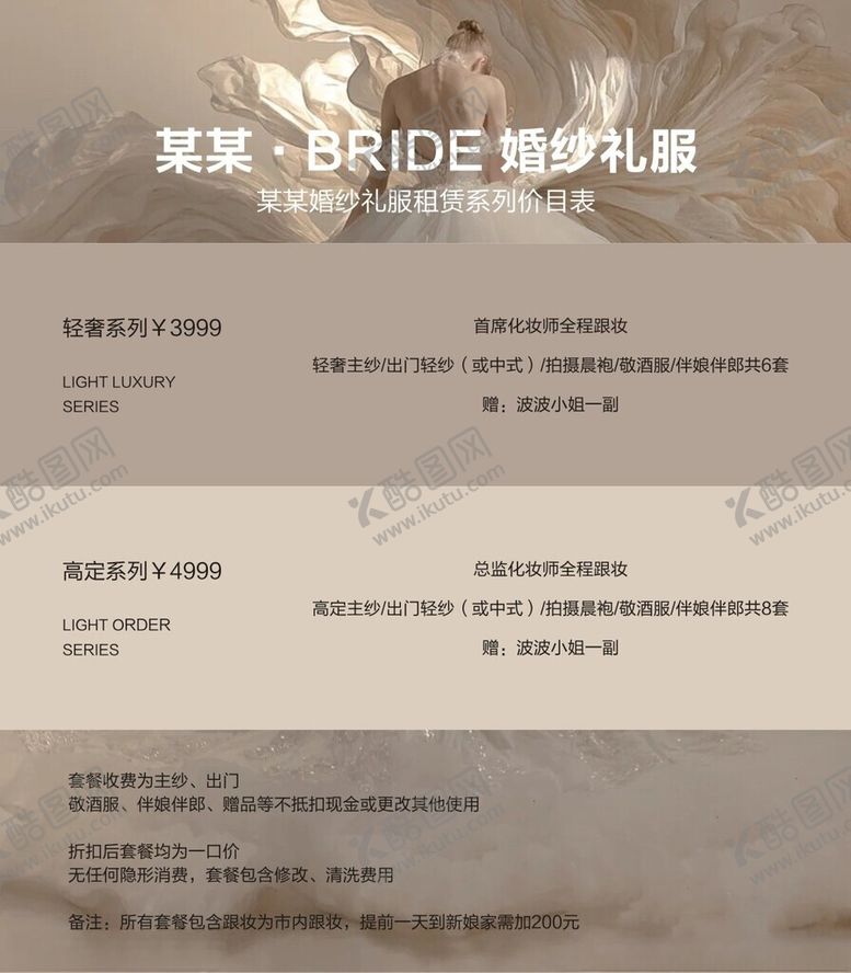 酷图网为你提供精美好看的素材模板下载,本次平面广告作品主题是婚纱价目表,素材ID编号是14527712101945513714,格式是CDR,建议使用打开编辑,或是"通过网上查询一下对应格式的打开软件";该婚纱价目表素材大小是1.98 MB,素材主要颜色以灰色为主,素材分享方式属于