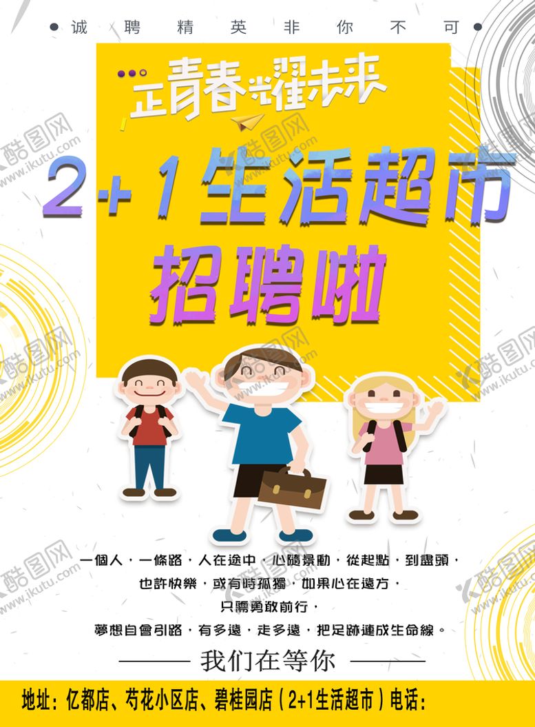 共享素材,尺寸大小是2480*3366像素,超市招聘是由平面广告设计师lfbllfbl上传,浏览本次作品的您可能还对超市招聘,招聘,生活超市,招工,青春,,平面广告,,平面广告感兴趣。