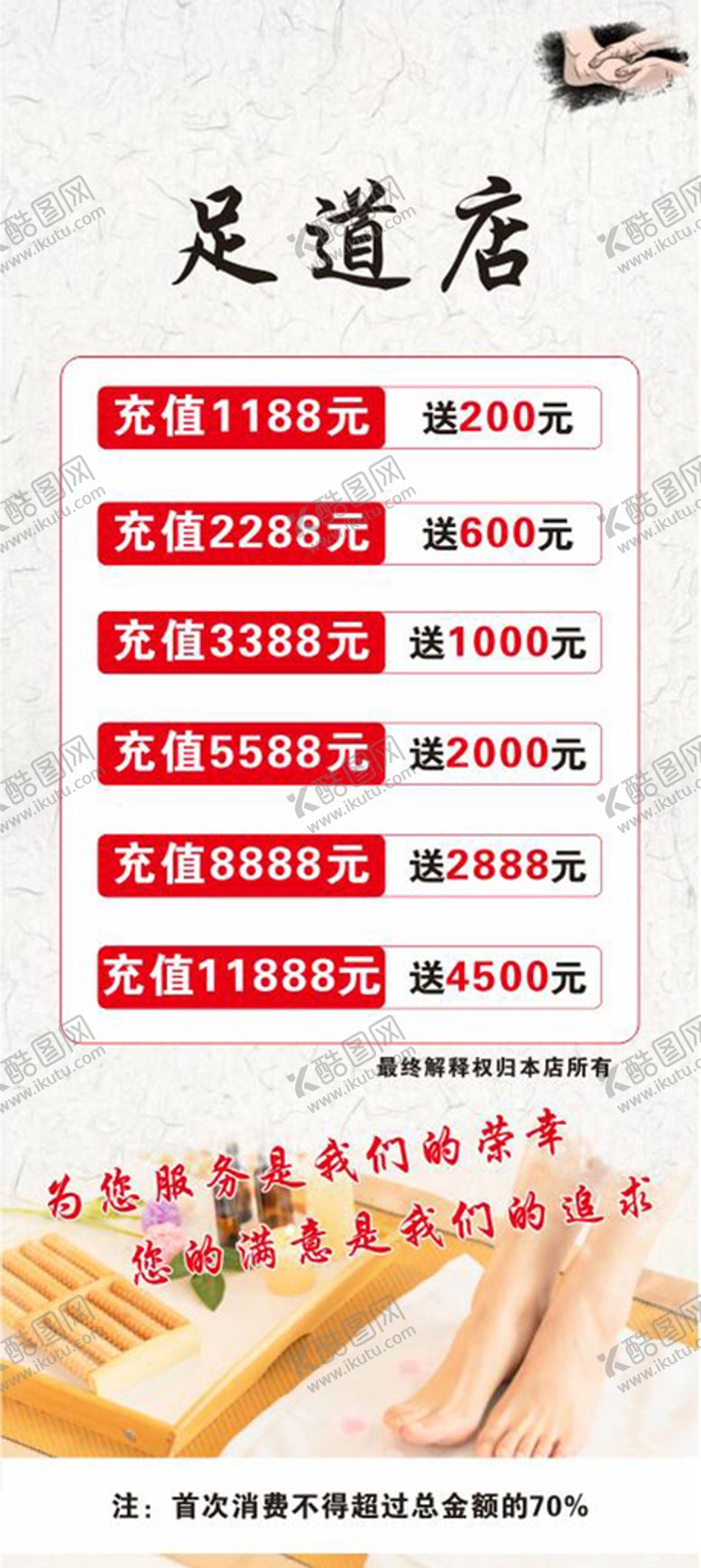 酷图网为你提供精美好看的素材模板下载,本次平面广告作品主题是足浴足道洗脚充值活动展架,素材ID编号是15062501201424596161,格式是CDR,建议使用打开编辑,或是"通过网上查询一下对应格式的打开软件";该足浴足道洗脚充值活动展架素材大小是46.8 MB,素材主要颜色以为主,素材分享方式属于