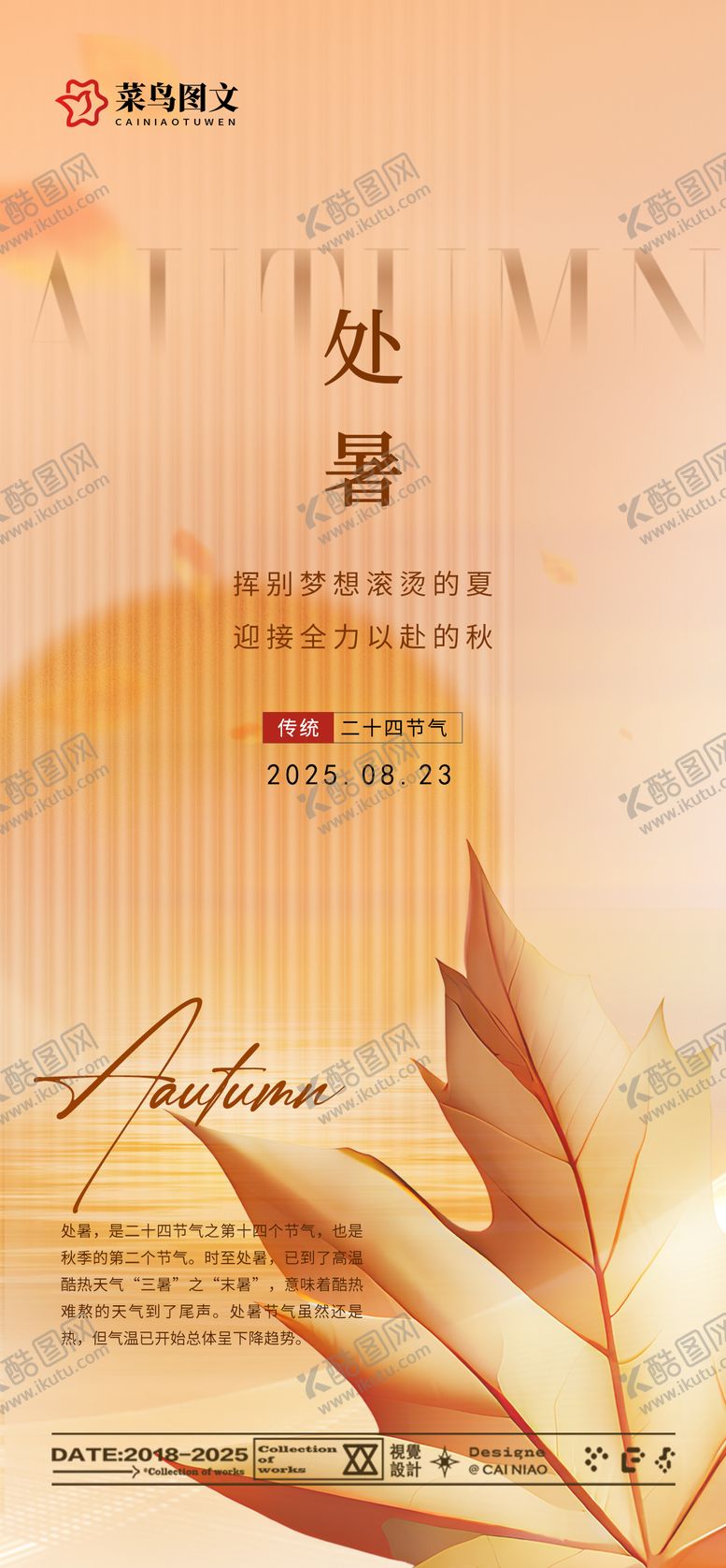 共享素材,尺寸大小是1181*2561像素,处暑节气海报是由平面广告设计师huntout上传,浏览本次作品的您可能还对海报,二十四节气,处暑,秋天,树叶,,平面广告,,平面广告感兴趣。