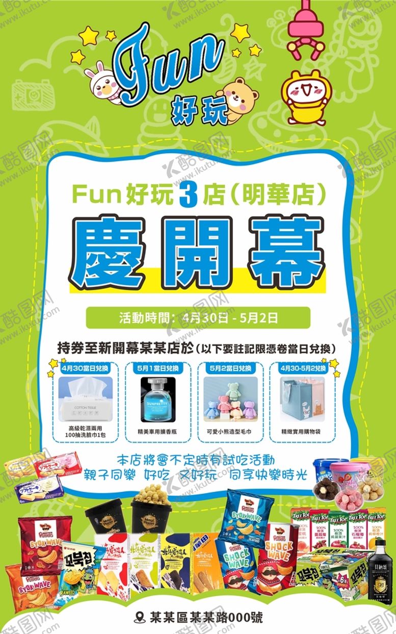 原创共享素材,尺寸大小是0*0像素,游乐园开业是由平面广告设计师ktyl2000上传,浏览本次作品的您可能还对游乐园开业,游乐园,开业,开业庆典,抓娃娃,娃娃机,活动,开业活动,零食,零食素材,卡通海报,开幕,平面广告,,平面广告感兴趣。
