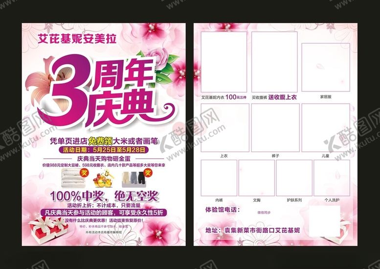 像素,服装店3周年宣传单是由平面广告设计师newlinge上传,浏览本次作品的您可能还对服装店宣传单,服装店单页,服装宣传单,3周年宣传单,3周年单页,服装传单,平面广告,,平面广告感兴趣。