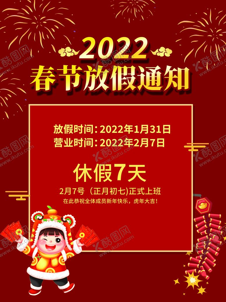 共享素材,尺寸大小是3543*4724像素,春节放假通知是由平面广告设计师rmbsaxn上传,浏览本次作品的您可能还对放假海报,春节放假通知,放假通知,节日放假通知,虎年,放假通知公告,放假,新年海报,春节放假,通知海报,春节放假公告,公告海报模板,2022,虎年放假通知,春节放假海报,元旦放假通知,新年放假,春节,公司放假通知,企业放假通知,新年放假通知,电商放假通知,电商通知,春节通知,除夕放假,,平面广告,,平面广告感兴趣。