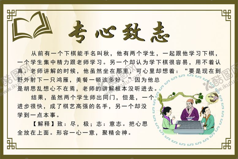 酷图网为你提供精美好看的素材模板下载,本次平面广告作品主题是专心致志成语故事,素材ID编号是21417101190708312376,格式是CDR,建议使用打开编辑,或是"通过网上查询一下对应格式的打开软件";该专心致志成语故事素材大小是3.38 MB,素材主要颜色以为主,素材分享方式属于