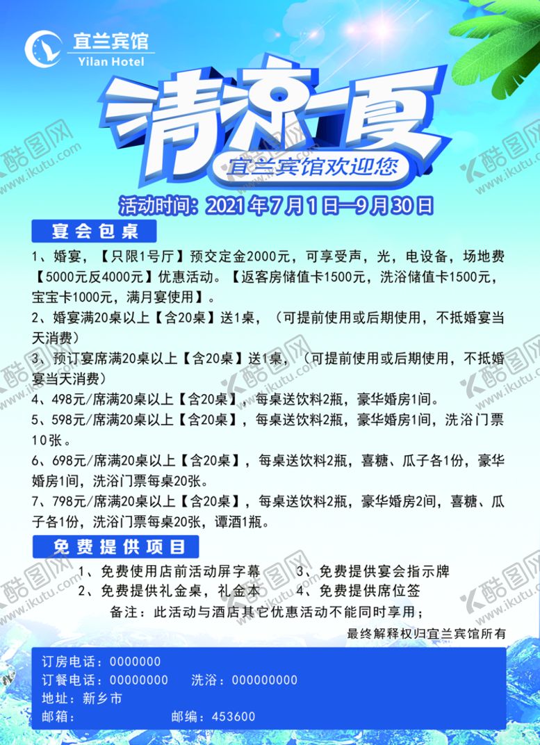 共享素材,尺寸大小是2421*3343像素,清凉一夏单页是由平面广告设计师jiu999上传,浏览本次作品的您可能还对清凉一夏,展架,蓝色,宾馆单页,宴会包桌,,平面广告,,平面广告感兴趣。