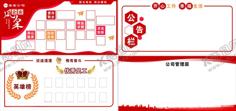 酷图网为你提供精美好看的素材模板下载,本次平面广告作品主题是企业文化墙,素材ID编号是26876410070514106478,格式是CDR,建议使用打开编辑,或是"通过网上查询一下对应格式的打开软件";该企业文化墙素材大小是6.28 MB,素材主要颜色以白色为主,素材分享方式属于