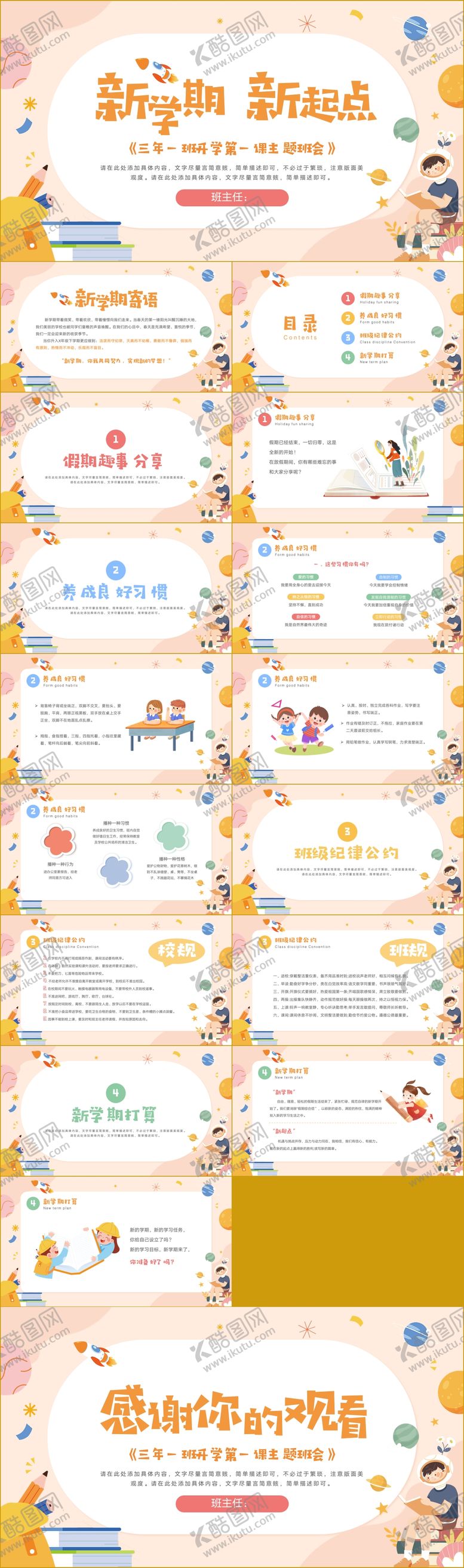 酷图网为你提供精美好看的素材模板下载,本次平面广告作品主题是卡通校园新学期开学第一课PPT,素材ID编号是27702812051047395564,格式是PPT,建议使用打开编辑,或是"通过网上查询一下对应格式的打开软件";该卡通校园新学期开学第一课PPT素材大小是25.13 MB,素材主要颜色以白色为主,素材分享方式属于
