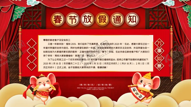 共享素材,尺寸大小是4724*2657像素,春节放假通知是由平面广告设计师xm121上传,浏览本次作品的您可能还对春节放假通知,2021放假通知,通知,过年放假通知,2021牛年,放假通知公告,放假,春节放假,通知海报,春节放假公告,公告海报模板,2021,过年,牛年放假通知,春节放假海报,春节宣传栏,新年放假,春节,公司放假通知,企业放假通知,平面广告,,平面广告感兴趣。