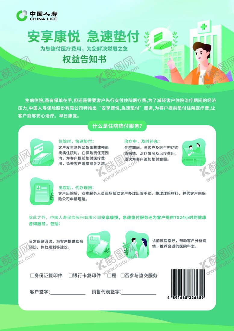 原创共享素材,尺寸大小是4961*7016像素,中国人寿 安享康悦 急速垫付是由平面广告设计师jpyssy上传,浏览本次作品的您可能还对中国人寿A4,传单,安享康悦,急速垫付,权益告知书,医疗,费用,治疗,办理,保险,就医,医疗费,住院,快速垫付,垫付,人寿保险,中国,提供服务,签约,客户签字,销售,,平面广告,,平面广告感兴趣。