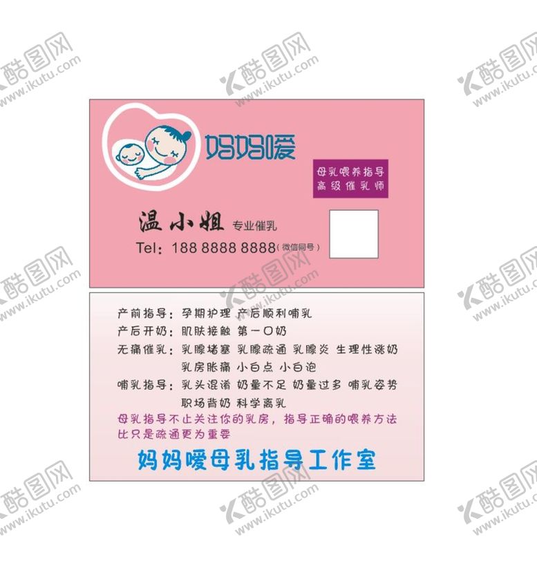 共享素材,尺寸大小是0*0像素,母婴月嫂月子中心名片是由平面广告设计师hncry上传,浏览本次作品的您可能还对母婴,月嫂,月子中心,催乳师,名片,平面广告,,平面广告感兴趣。