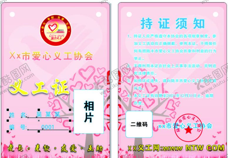 酷图网为你提供精美好看的素材模板下载,本次平面广告作品主题是义工证,素材ID编号是29321204070512087976,格式是CDR,建议使用打开编辑,或是"通过网上查询一下对应格式的打开软件";该义工证素材大小是949.5 KB,素材主要颜色以粉色为主,素材分享方式属于