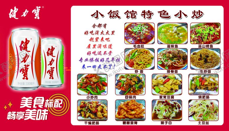 原创共享素材,尺寸大小是5953*3402像素,健力宝小饭馆特色菜单是由平面广告设计师moon_____light上传,浏览本次作品的您可能还对广告,设计,饭馆,健力宝,特色菜,炒菜,平面广告,,平面广告感兴趣。