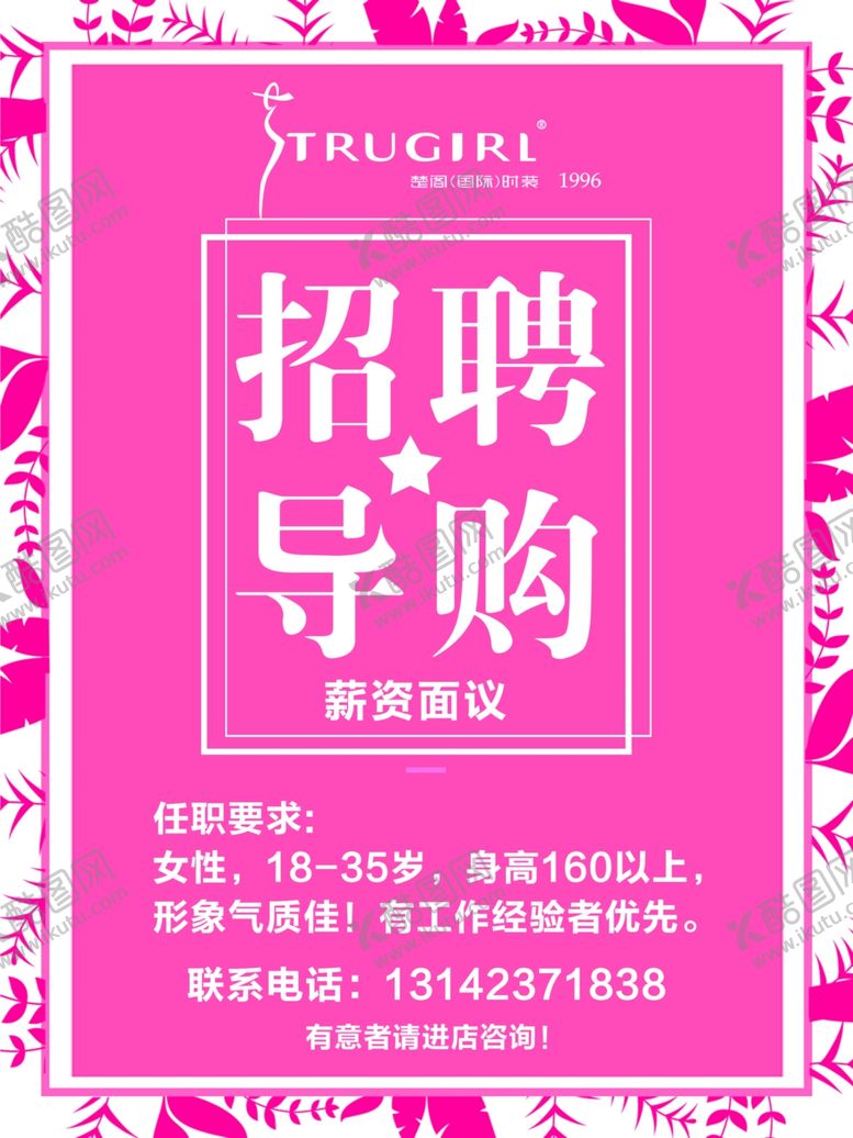 原创共享素材,尺寸大小是2362*3150像素,招聘是由平面广告设计师vergillove上传,浏览本次作品的您可能还对招聘,招聘导购,粉色招聘,女装招聘,导购员,招聘底图,,平面广告,,平面广告感兴趣。