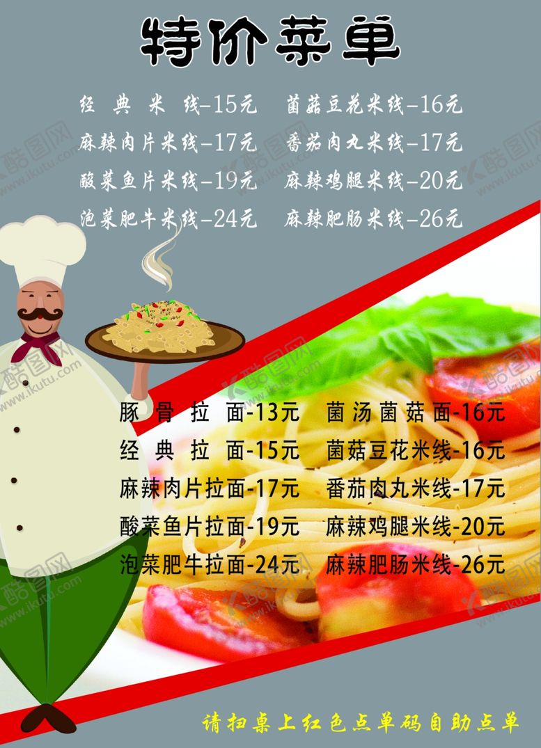 共享素材,尺寸大小是1843*2551像素,菜单是由平面广告设计师kpyuy上传,浏览本次作品的您可能还对米线,特价菜单,菜单,胖仔厨师,拉面,平面广告,,平面广告感兴趣。
