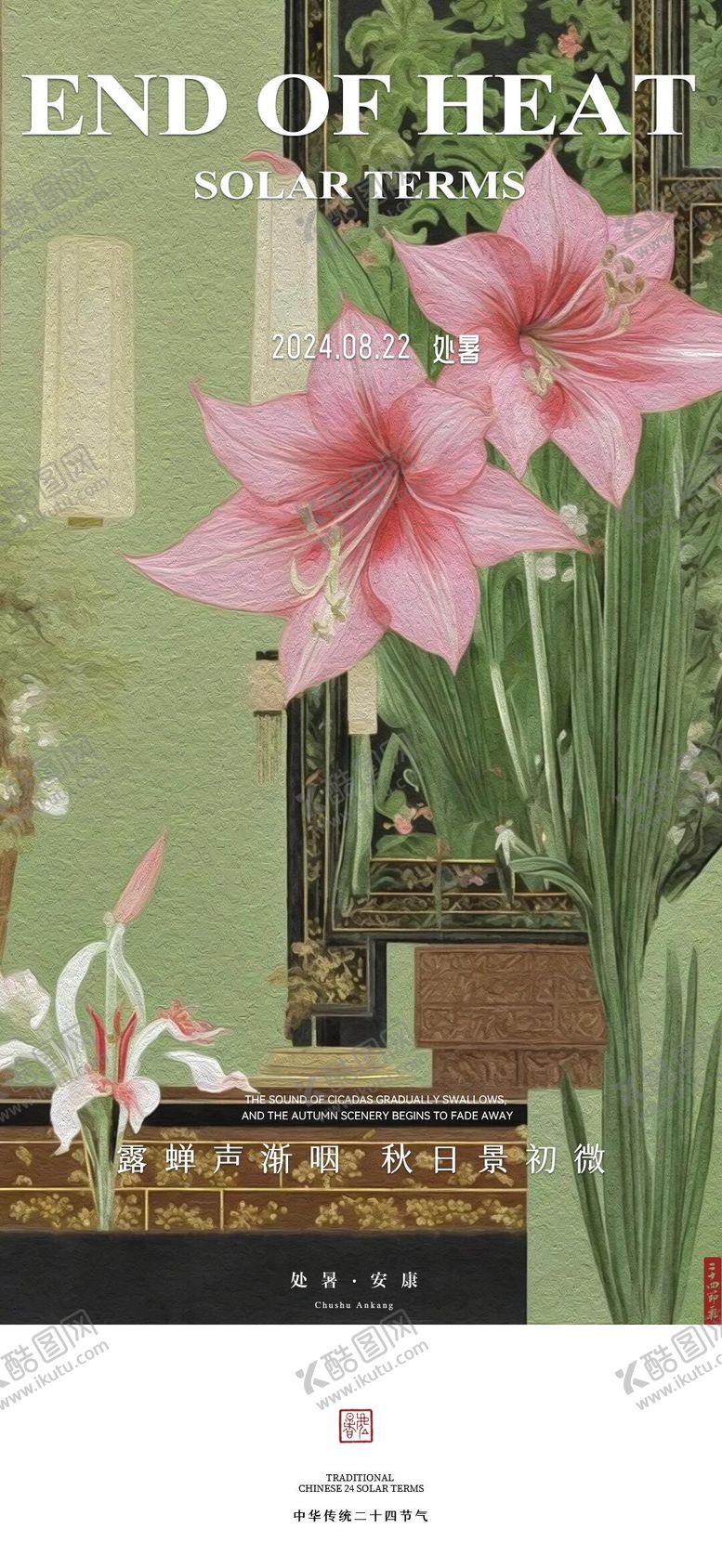 共享素材,尺寸大小是1080*2346像素,处暑节气海报是由平面广告设计师ghca123上传,浏览本次作品的您可能还对海报,处暑,二十四节气,油画,肌理,百合,中式,,平面广告,,平面广告感兴趣。