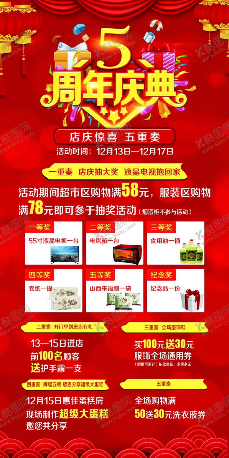 共享素材,尺寸大小是1969*3937像素,5周年庆典是由平面广告设计师limingxhss2上传,浏览本次作品的您可能还对5周年,周年庆典,超市活动,过年背景,祥云,灯笼,平面广告,,平面广告感兴趣。
