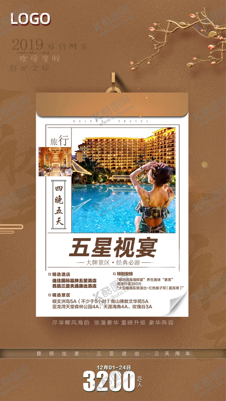 共享素材,尺寸大小是1276*2268像素,五星视宴是由平面广告设计师xiaofengwuxuan123上传,浏览本次作品的您可能还对五星视宴,海南,旅行,海报,海景,海边,行走,高端,土黄,洋气,日历,平面广告,,平面广告感兴趣。