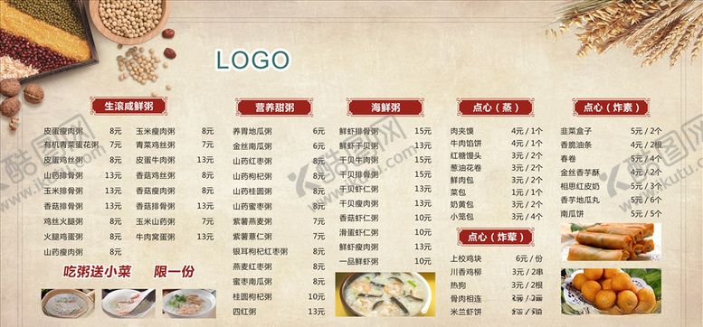 酷图网为你提供精美好看的素材模板下载,本次平面广告作品主题是粥菜单,素材ID编号是39861404281952122643,格式是CDR,建议使用打开编辑,或是"通过网上查询一下对应格式的打开软件";该粥菜单素材大小是154.54 MB,素材主要颜色以粉色为主,素材分享方式属于