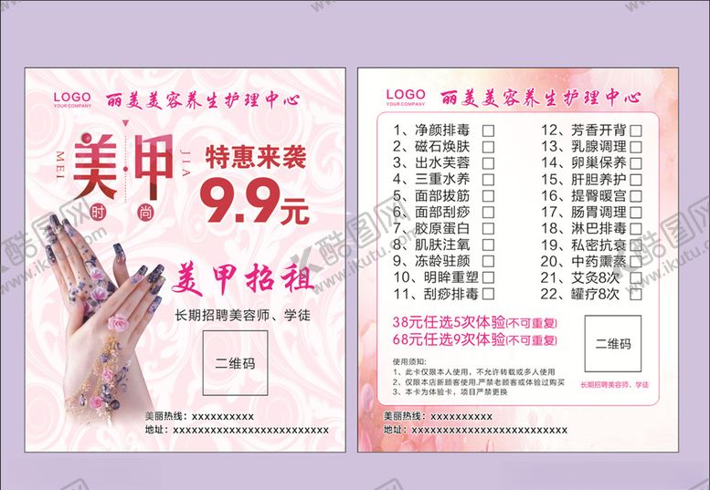 像素,美容美甲养生护理卡片是由平面广告设计师boge09上传,浏览本次作品的您可能还对美甲,美甲卡片,养生护理,美容养生,美甲特惠,美容卡,平面广告,,平面广告感兴趣。