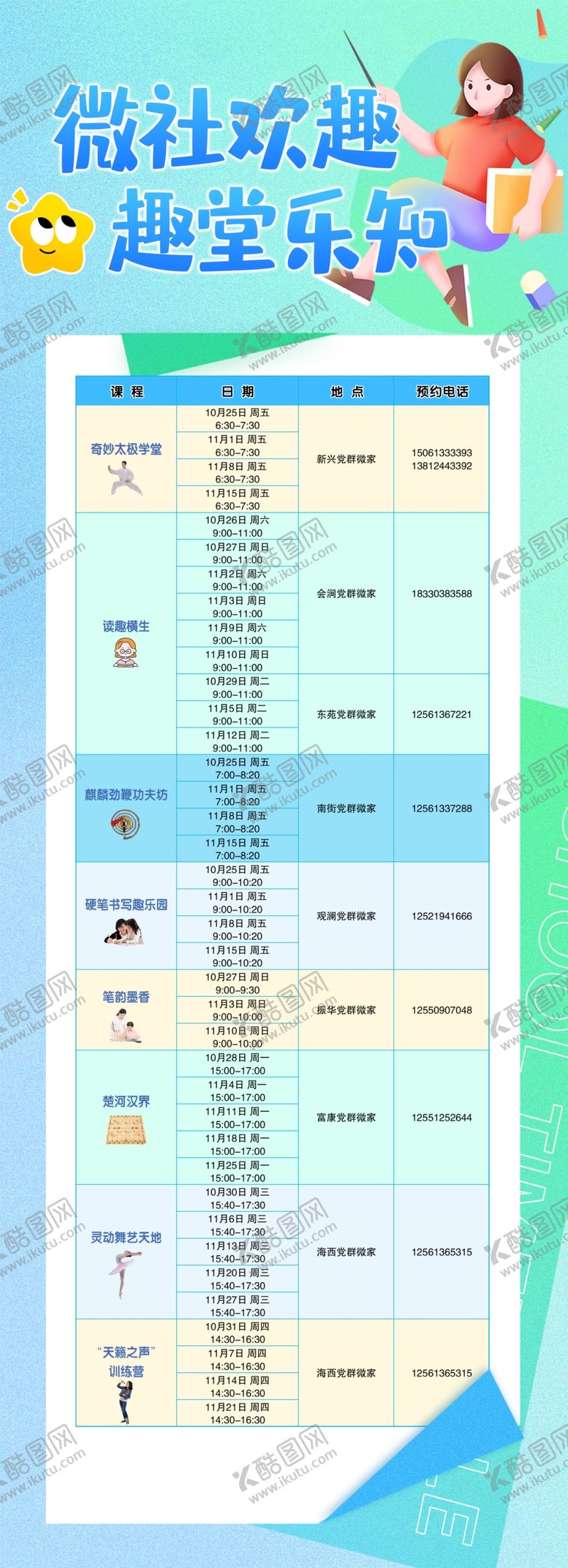 共享素材,尺寸大小是1782*4921像素,社区课程表是由免抠元素设计师lixuechao0926上传,浏览本次作品的您可能还对课程表,课堂表,社区课程,微课堂,兴趣班课程表,课程表宣传,课程表海报,微社区,社区海报,社区宣传,免抠元素,,免抠元素感兴趣。