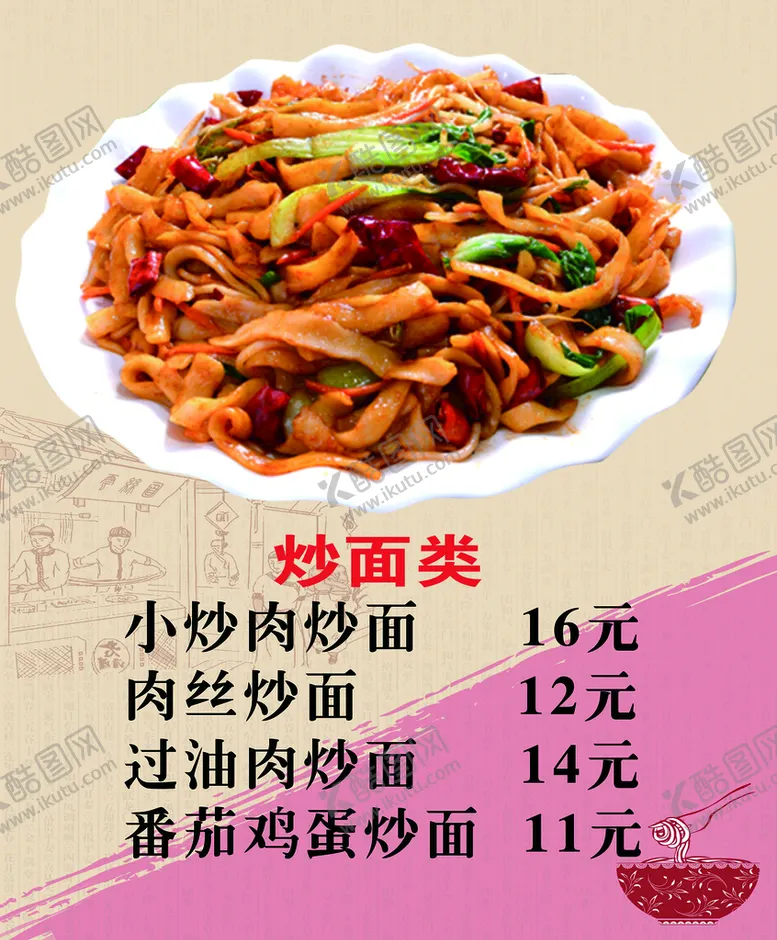 共享素材,尺寸大小是2811*3402像素,炒面菜单是由平面广告设计师zhaojifeng177上传,浏览本次作品的您可能还对炒面菜单,小炒肉炒面,肉丝炒面,过油肉炒面,番茄鸡蛋炒面,粉色背景,,平面广告,,平面广告感兴趣。