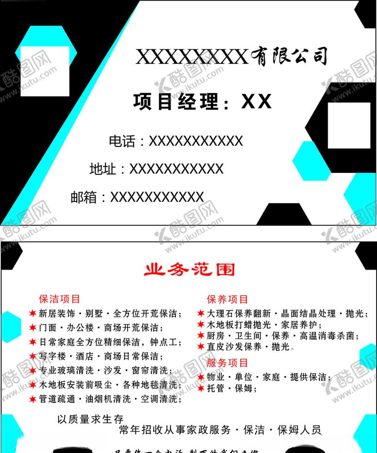 像素,物业名片名片是由平面广告设计师dianq上传,浏览本次作品的您可能还对物业名片,物业,名片,清洁,保洁,钟点工,平面广告,,平面广告感兴趣。