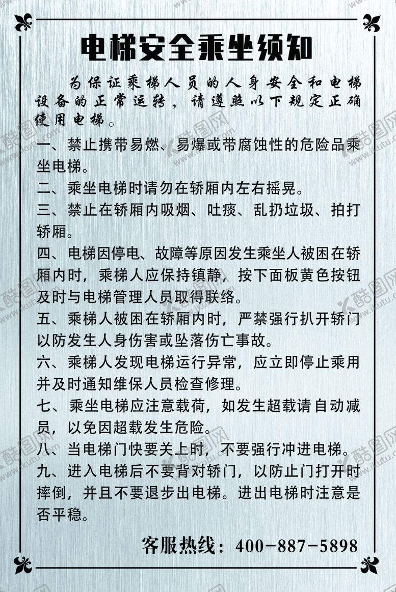 酷图网为你提供精美好看的素材模板下载,本次平面广告作品主题是电梯安全乘坐须知,素材ID编号是40939404201738236658,格式是PSD,建议使用打开编辑,或是"通过网上查询一下对应格式的打开软件";该电梯安全乘坐须知素材大小是91.02 MB,素材主要颜色以白色为主,素材分享方式属于