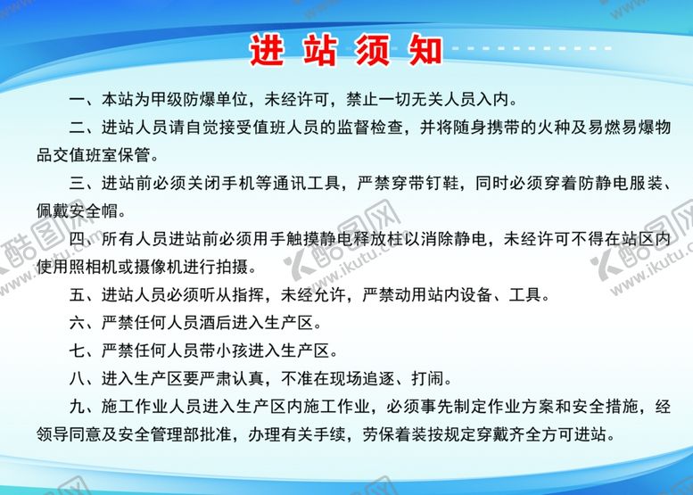原创共享素材,尺寸大小是4134*2953像素,进站须知是由免抠元素设计师suyi0911上传,浏览本次作品的您可能还对进站须知,进站条例,进站制度,蓝色背景,蓝色展板,免抠元素,,免抠元素感兴趣。