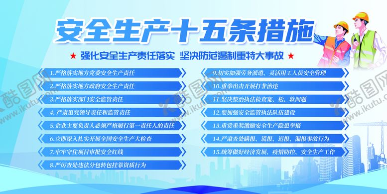 酷图网为你提供精美好看的素材模板下载,本次免抠元素作品主题是安全生产十五条措施展板,素材ID编号是42098309211710202087,格式是PSD,建议使用打开编辑,或是"通过网上查询一下对应格式的打开软件";该安全生产十五条措施展板素材大小是144.35 MB,素材主要颜色以白色为主,素材分享方式属于