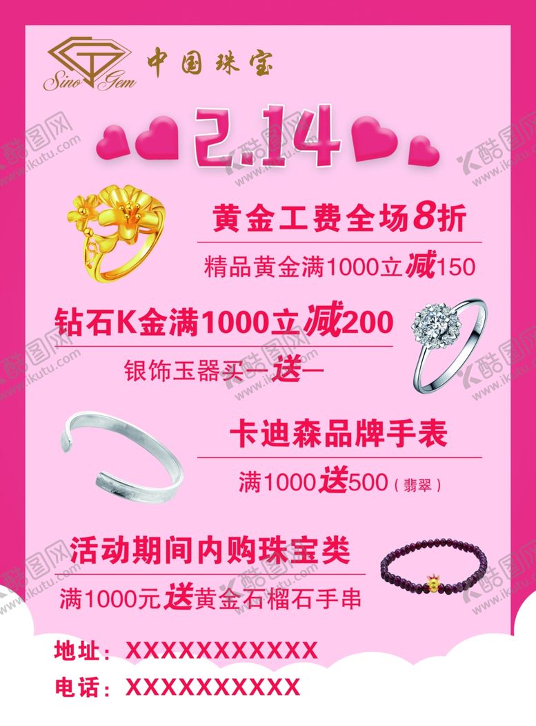 共享素材,尺寸大小是2504*3390像素,2.14情人节海报是由平面广告设计师hhkjtest上传,浏览本次作品的您可能还对情人节,海报,214元素,珠宝活动,粉色,平面广告,,平面广告感兴趣。
