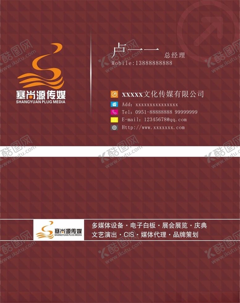 酷图网为你提供精美好看的素材模板下载,本次平面广告作品主题是名片设计,素材ID编号是45336402190115437408,格式是CDR,建议使用打开编辑,或是"通过网上查询一下对应格式的打开软件";该名片设计素材大小是702.66 KB,素材主要颜色以棕色为主,素材分享方式属于