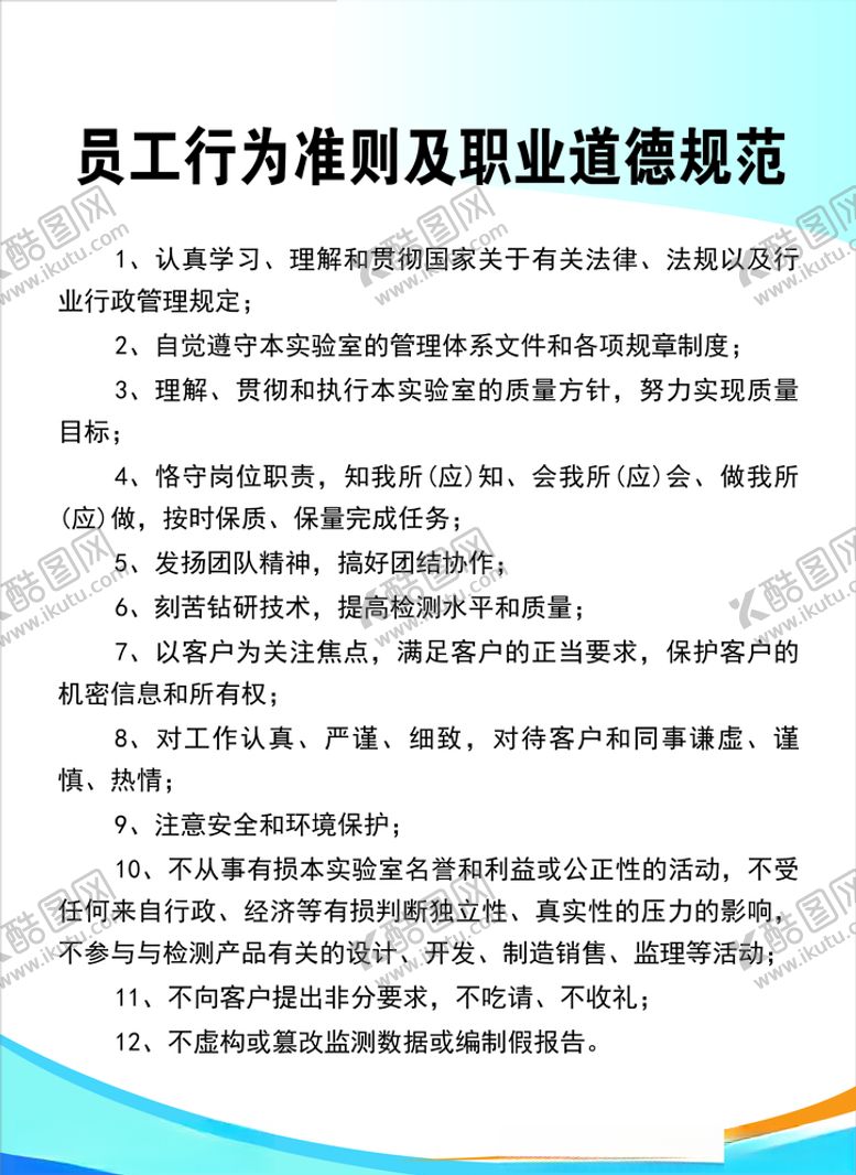 酷图网为你提供精美好看的素材模板下载,本次平面广告作品主题是员工行为准则及职业道德规范,素材ID编号是45507104270749129429,格式是CDR,建议使用打开编辑,或是"通过网上查询一下对应格式的打开软件";该员工行为准则及职业道德规范素材大小是286.93 KB,素材主要颜色以白色为主,素材分享方式属于