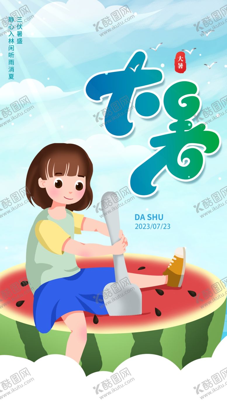 共享素材,尺寸大小是1080*1920像素,大暑是由平面广告设计师yisheng8585上传,浏览本次作品的您可能还对卡通插画,24节气,二十四节气,中国传统节气,大暑,大暑时节,大暑节气,小女孩,女孩,西瓜,吃西瓜,平面广告,,平面广告感兴趣。