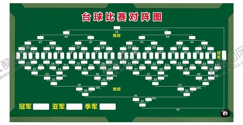 酷图网为你提供精美好看的素材模板下载,本次平面广告作品主题是台球比赛对阵图,素材ID编号是46912103011459253422,格式是CDR,建议使用打开编辑,或是"通过网上查询一下对应格式的打开软件";该台球比赛对阵图素材大小是5.63 MB,素材主要颜色以绿色为主,素材分享方式属于