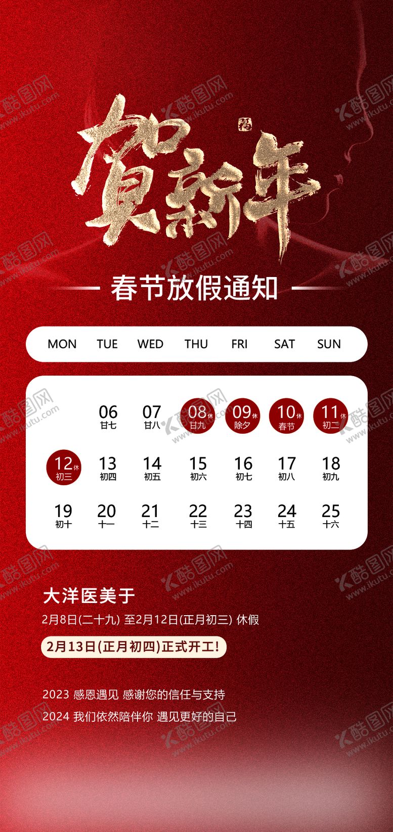 共享素材,尺寸大小是900*2000像素,医美新年放假通知海报是由平面广告设计师JK0803_chenjiehua上传,浏览本次作品的您可能还对海报,医美,整形,春节,放假通知,,平面广告,,平面广告感兴趣。