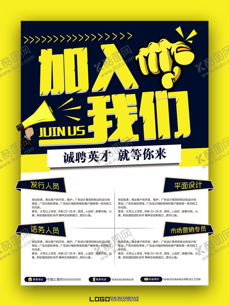 酷图网为你提供精美好看的素材模板下载,本次平面广告作品主题是招聘,素材ID编号是48571309201127394320,格式是TIF,建议使用打开编辑,或是"通过网上查询一下对应格式的打开软件";该招聘素材大小是4.74 MB,素材主要颜色以黄色为主,素材分享方式属于