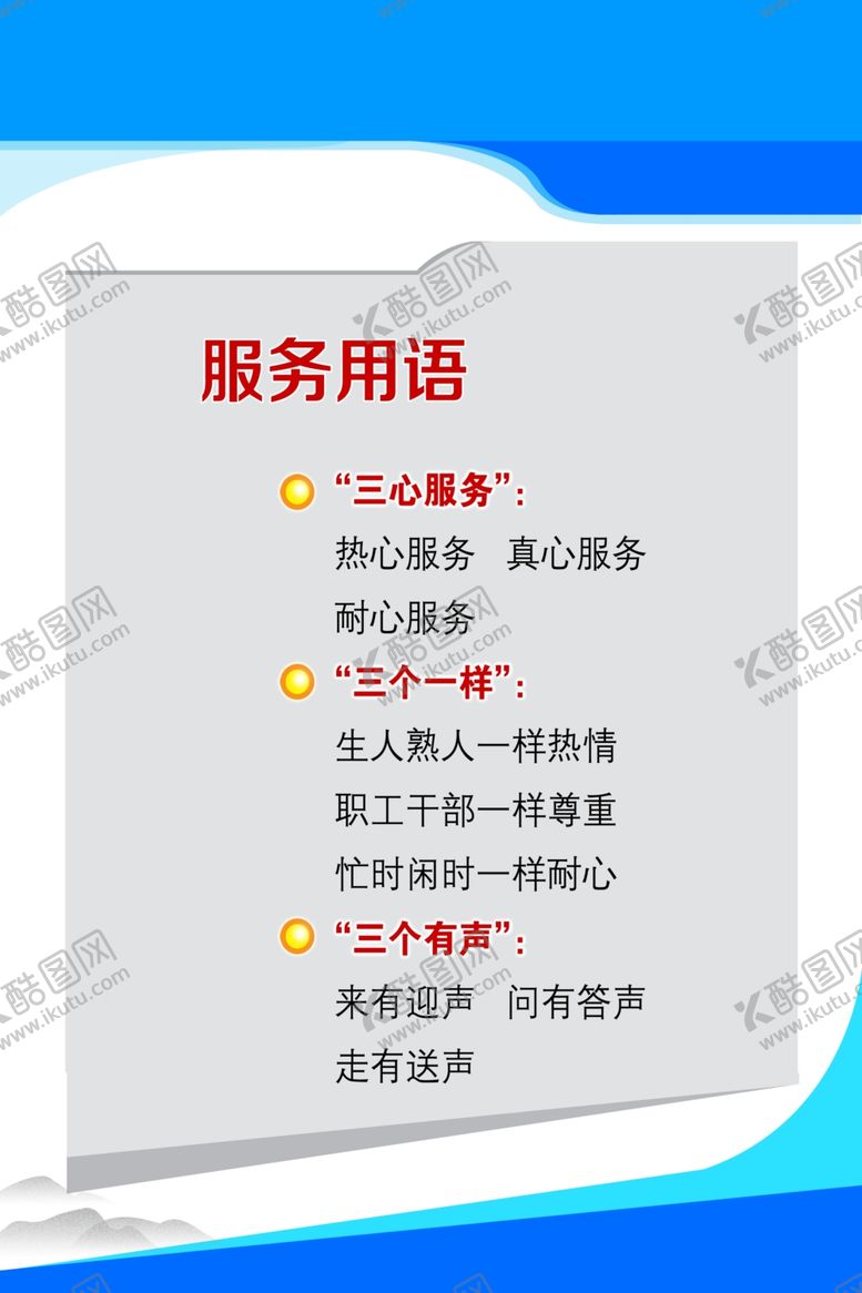 酷图网为你提供精美好看的素材模板下载,本次平面广告作品主题是服务用语展板图片,素材ID编号是50283112061215583087,格式是PSD,建议使用打开编辑,或是"通过网上查询一下对应格式的打开软件";该服务用语展板图片素材大小是4.39 MB,素材主要颜色以白色为主,素材分享方式属于