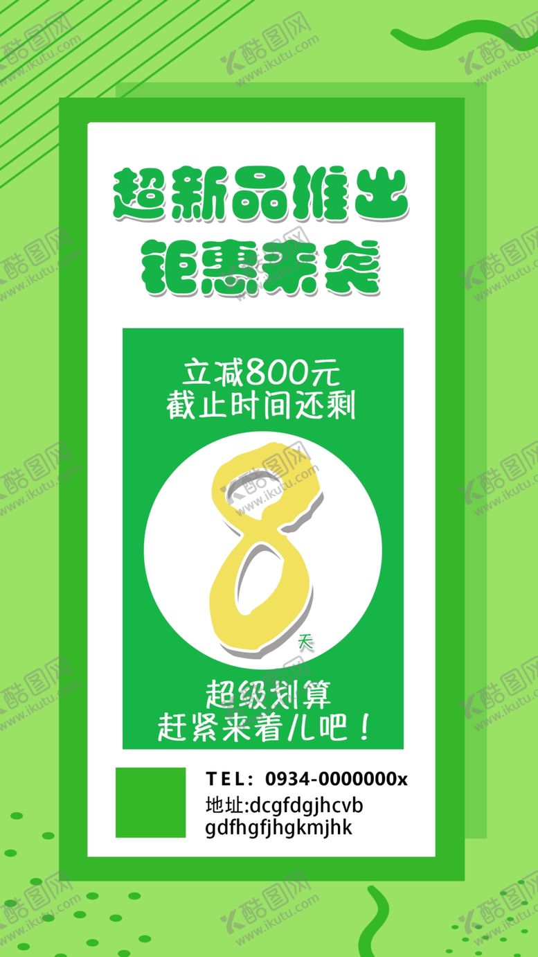 共享素材,尺寸大小是1242*2208像素,聚惠来袭倒计时海报是由平面广告设计师pingli_lp上传,浏览本次作品的您可能还对开业活动,倒计时,新品推出,钜惠来袭,朋友圈海报,绿色,,平面广告,,平面广告感兴趣。
