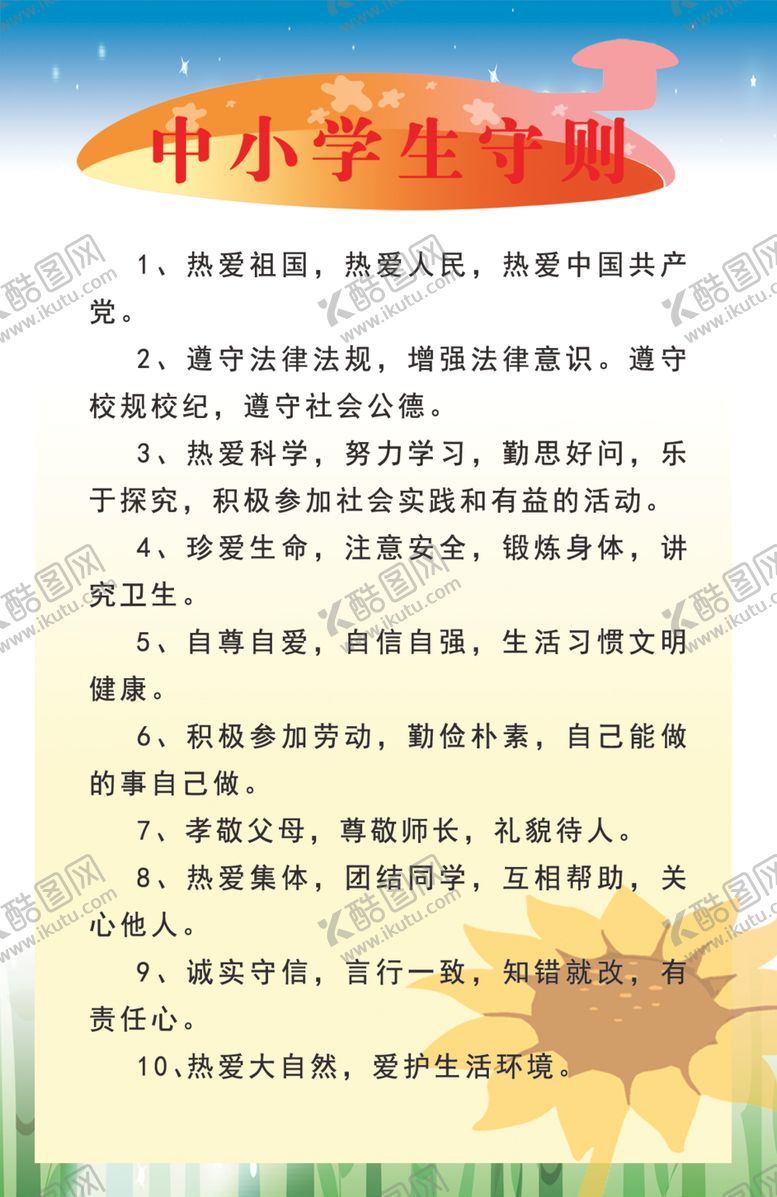 共享素材,尺寸大小是1165*1795像素,中小学生守则是由平面广告设计师qiujunzhang上传,浏览本次作品的您可能还对中小学,学生守则,上墙制度,制作,排版,平面广告,,平面广告感兴趣。