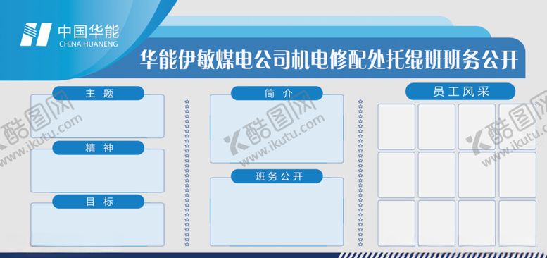 共享素材,尺寸大小是240*120像素,员工风采班务公开是由平面广告设计师Java8657上传,浏览本次作品的您可能还对华能,煤电,修配,班务,主题,目标,员工风采,展板,平面广告,,平面广告感兴趣。