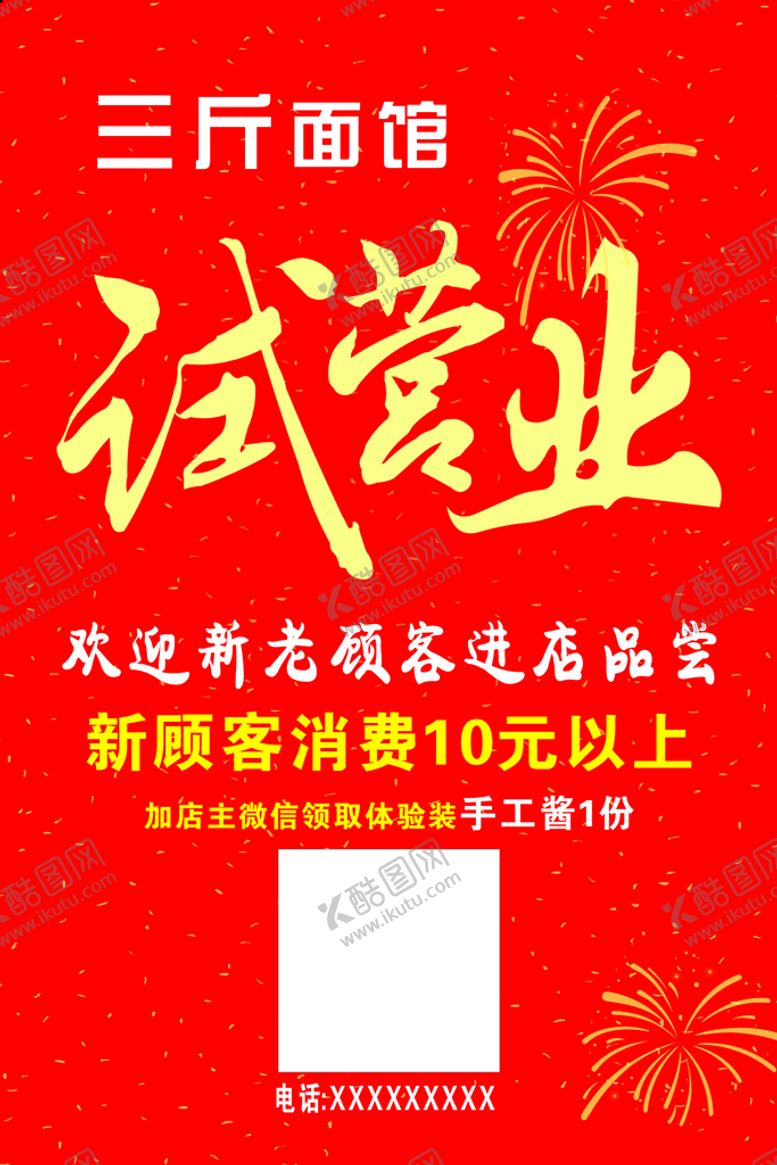 酷图网为你提供精美好看的素材模板下载,本次平面广告作品主题是试营业海报,素材ID编号是55383501270659509511,格式是CDR,建议使用打开编辑,或是"通过网上查询一下对应格式的打开软件";该试营业海报素材大小是3.26 MB,素材主要颜色以红色为主,素材分享方式属于