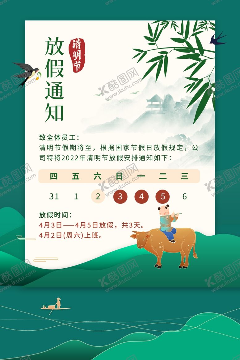 共享素材,尺寸大小是3543*5315像素,清明放假通知 是由平面广告设计师kingworsebest上传,浏览本次作品的您可能还对清明放假通知,2022清明节,2022清明放假,清明节海报,放假通知,清明,踏青,清明放假,清明节促销,清明节背景,清明节踏青,清明节展板,清明节宣传单,清明海报,清明促销,清明节日,吊旗,展架,清明节素材,清明节广告,清明节设计,清明踏青,通知,清明节祭祀,祭祖,放假通知海报,,平面广告,,平面广告感兴趣。