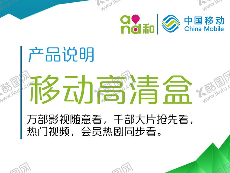 酷图网为你提供精美好看的素材模板下载,本次平面广告作品主题是中国移动产品说明 移动高清盒,素材ID编号是61028710042359307309,格式是PSD,建议使用打开编辑,或是"通过网上查询一下对应格式的打开软件";该中国移动产品说明 移动高清盒素材大小是2.1 MB,素材主要颜色以白色为主,素材分享方式属于