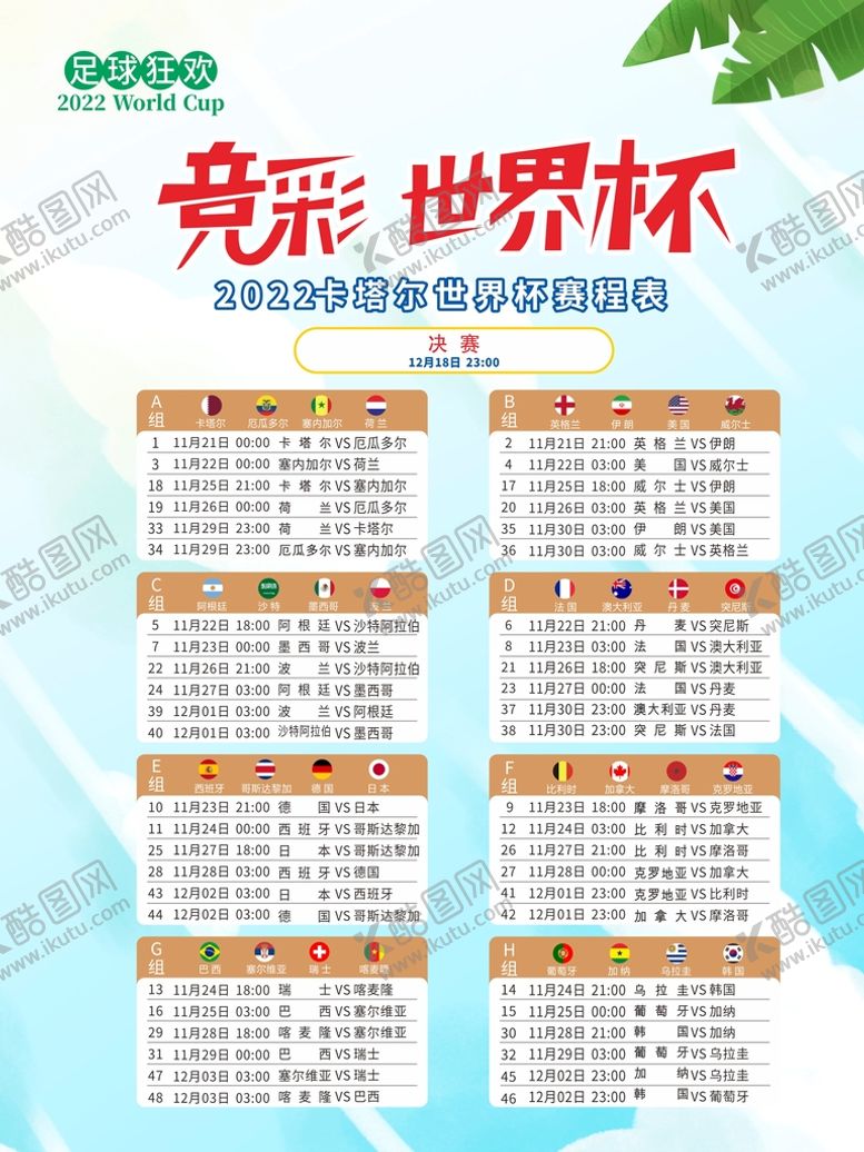 酷图网为你提供精美好看的素材模板下载,本次平面广告作品主题是世界杯赛程海报,素材ID编号是61327810011426340384,格式是CDR,建议使用打开编辑,或是"通过网上查询一下对应格式的打开软件";该世界杯赛程海报素材大小是8.22 MB,素材主要颜色以白色为主,素材分享方式属于