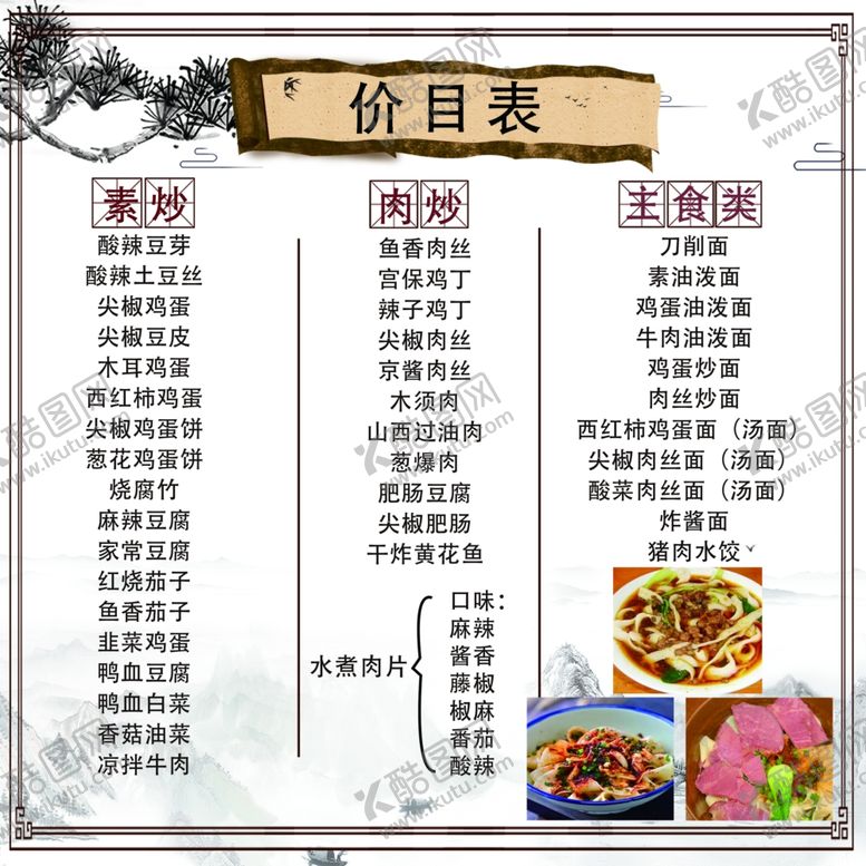 原创共享素材,尺寸大小是3150*3150像素,菜单参考是由平面广告设计师hfyou588上传,浏览本次作品的您可能还对菜单,价目表,素炒,主食类,肉炒,平面广告,,平面广告感兴趣。