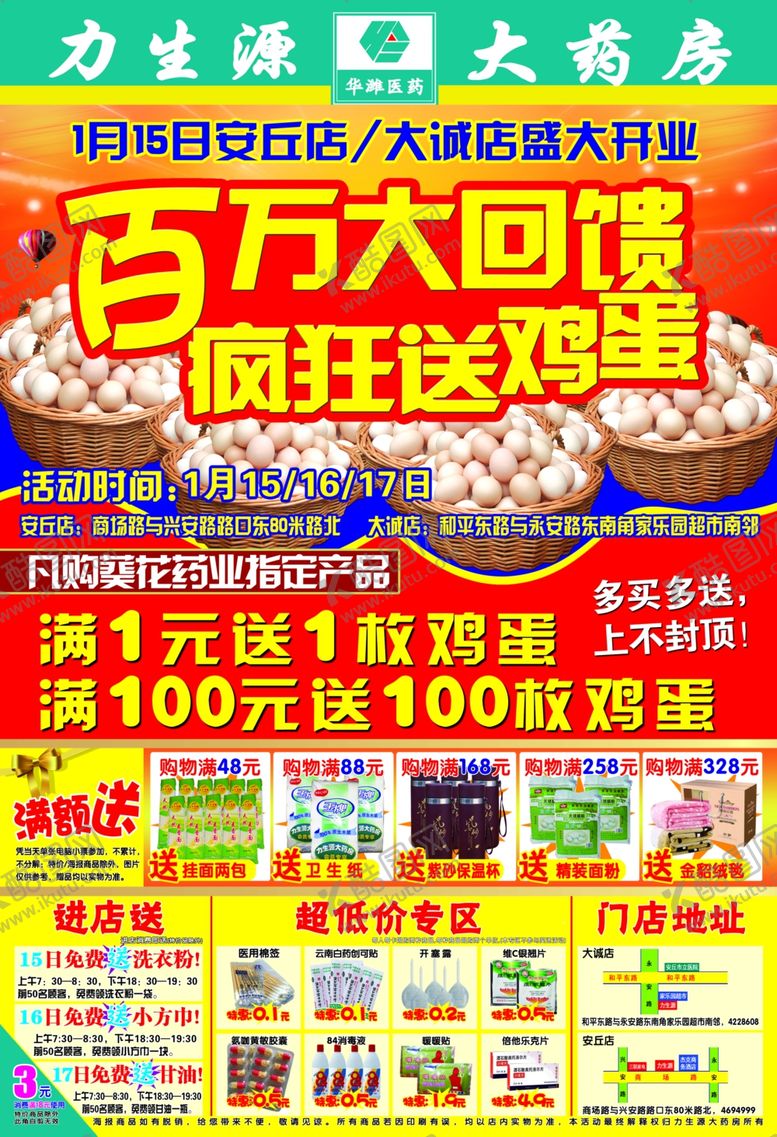 共享素材,尺寸大小是3437*5031像素,药店盛大开业DM是由免抠元素设计师nofeeling189上传,浏览本次作品的您可能还对药店,免费,送鸡蛋,免费送,开业,促销,DM单,宣传,大促,海报,免抠元素,,免抠元素感兴趣。