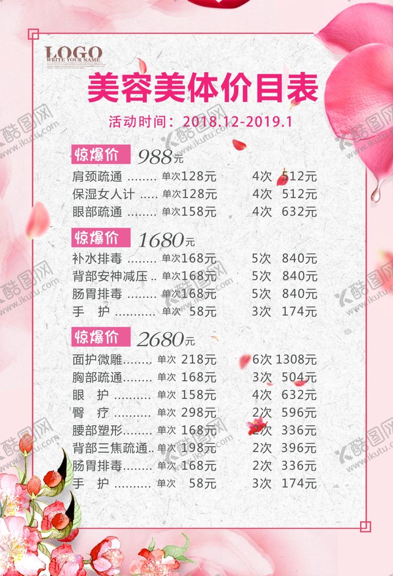 共享素材,尺寸大小是3543*5197像素,美容美体价格表是由平面广告设计师taodengjiang上传,浏览本次作品的您可能还对美容,美体,价格表,活动,单页,平面广告,,平面广告感兴趣。